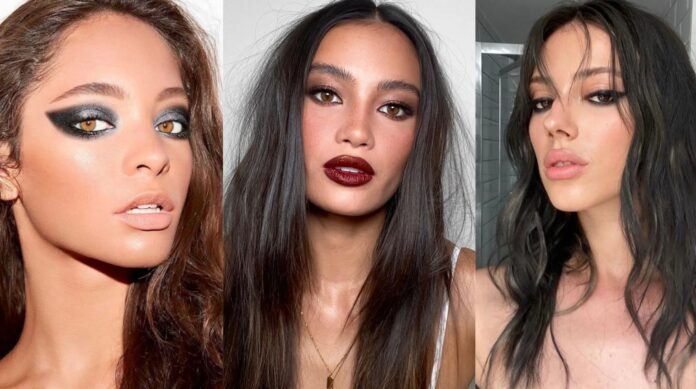 El grunge beauty se caracteriza por pieles naturales (casi sin base), labios en tonos vino o marrón oscuro, delineados difusos y sombras en negro, gris o borgoña que evocan una estética melancólica y artística. La clave está en la imperfección intencional: un smokey eye mal difuminado o un labial que parece corrido a propósito se convierten en símbolos de actitud.
