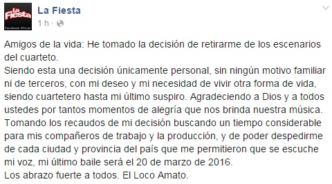 En el Facebook oficial de La Fiesta, confirmó que cantará hasta el 20 de marzo de 2016, fecha en la que hará su última presentación. La lejanía de esa cita, según publicó, se debe a que buscó un «tiempo considerable» para que los músicos que lo acompañan consigan otro trabajo.