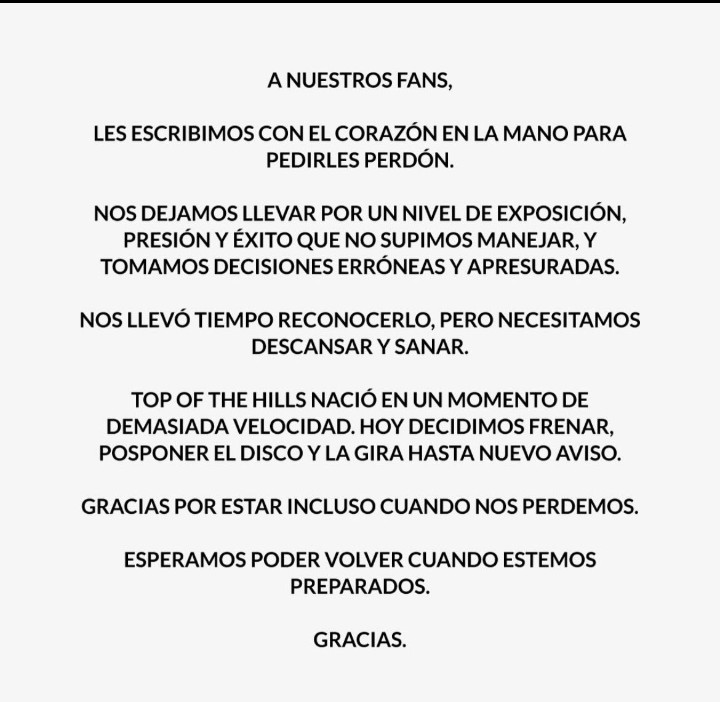 En el texto, Catriel y Paco explican que la decisión no fue inmediata, sino el resultado de un proceso interno: “Nos llevó tiempo reconocerlo, pero necesitamos descansar y sanar”. Además, señalan que Top Of The Hills nació en un contexto de “demasiada velocidad”, algo que los impulsó a poner una pausa y replantear el camino del proyecto.