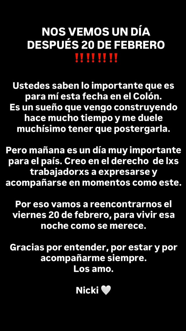 Nicki Nicole también aprovechó para expresar su postura frente al contexto social que atraviesa el país: “Mañana es un día muy importante para el país. Creo en el derecho de lxs trabajadorxs a expresarse y acompañarse en momentos como este”, escribió en un posteo que acompañó con un video dirigido a sus seguidores.