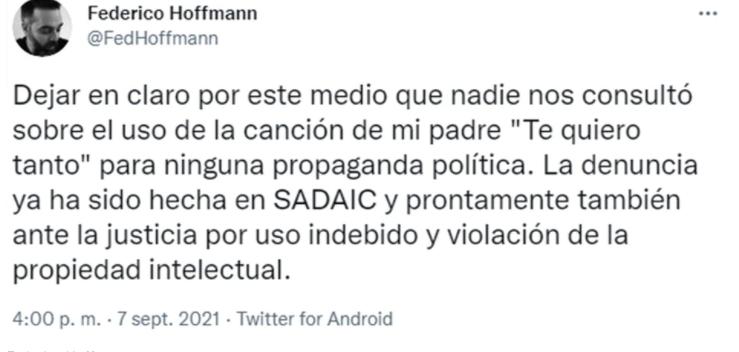 la denuncia que realizó el mayor de los hijos de Héctor Omar Hoffmann, como era el verdadero nombre del recordado ídolo, hace referencia a los actos del Frente de Todos que se realizaron en Tandil, provincia de Buenos Aires y en Goya, Corrientes, en los que se entonó la canción con la letra modificada.