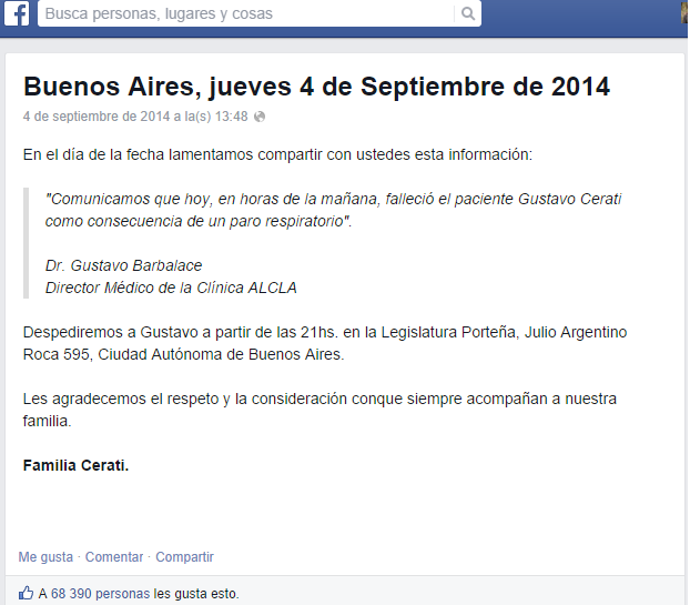 Sin embargo, luego de que varios medios lo dieran por hecho, llegó la confirmación a través de un comunicado oficial de la clínica ALCLA, donde estaba internado desde el 2010.