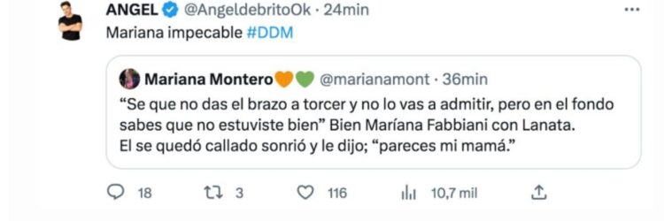 Mientras que Jorge Lanata estaba al aire en DDM (América TV), Ángel de Brito respondió a los dichos del periodistas en su contra: «Yo te sigo queriendo. #DDM ¡Es un debate! #Lanata».