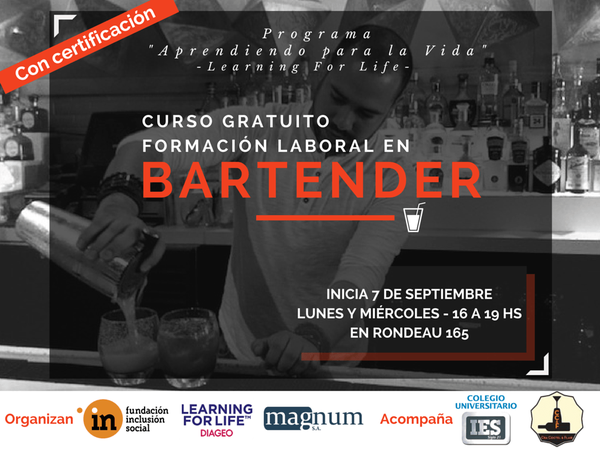 La Fundación Inclusión Social invita a jóvenes entre 18 y 30 años a participar del curso gratuito de Formación Laboral en Bartender. El curso es organizado junto con las empresas de Diageo y Magnum S.A.
