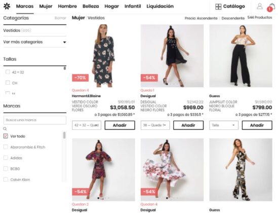 En cada categoría el sitio web te brinda la opción de buscar por marca o producto y para cada categoría existe una subcategoría. Por ejemplo, en mujer puedes buscar por destacados, por marcas recién añadidas, o por subcategorías como blusas o vestidos, entre otras más.