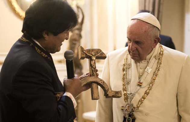 El Santo Padre tuvo una expresión que llamó la atención cuando el presidente boliviano le obsequió un Cristo sobre una hoz y un martillo. Al verlo dijo: “No está bien eso”.Entrá y mirá el video